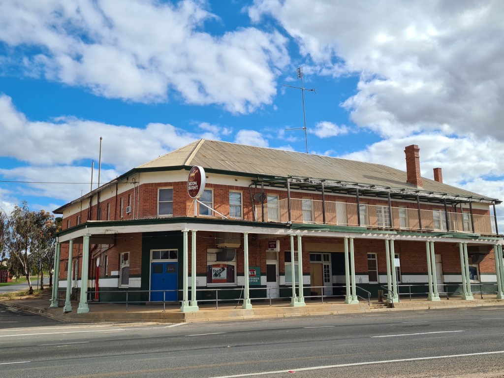 We crossed the border into Victoria just past Pinaroo on the Mallee Hwy. We decided to stop for the night at Underbool, a small wheat town where the police station is unattended, the pub is closed, and the General Store has been closed for a very long time. There is a post office and apparently the bowling club continues to operate. The park opposite the police station has nice grass for the critters. For a $10 donation we stayed the night with power and access to toilets and showers.