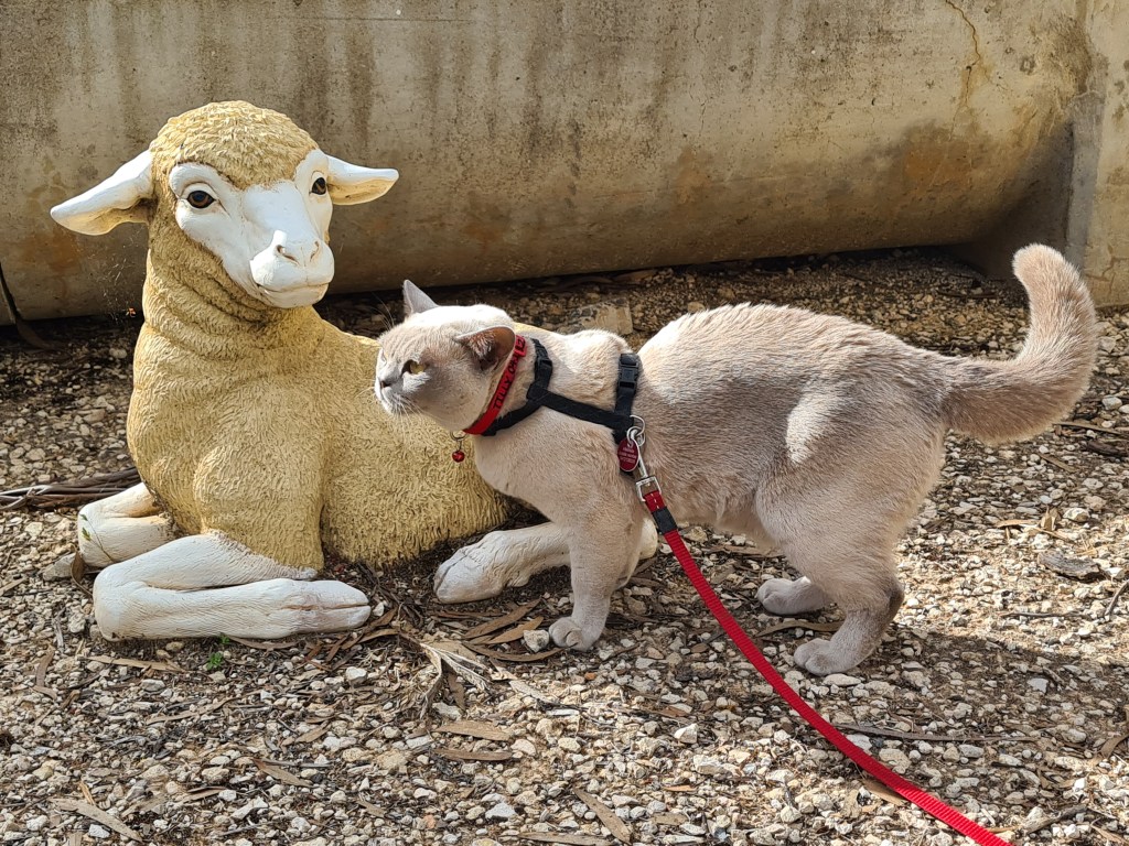 Eventually I realised she had been frightened by the statue of the lamb, which was “looking” in her direction. Even after I showed her the lamb was not alive, she was very wary.