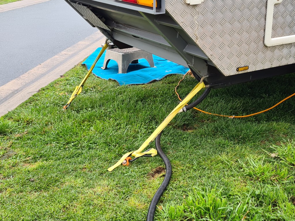 Fortunately we only had to contend with light rain while we refuelled in town and set up camp. Our site is small so we had to unhook. As the site slopes downhill I used straps and screw pegs for extra security.