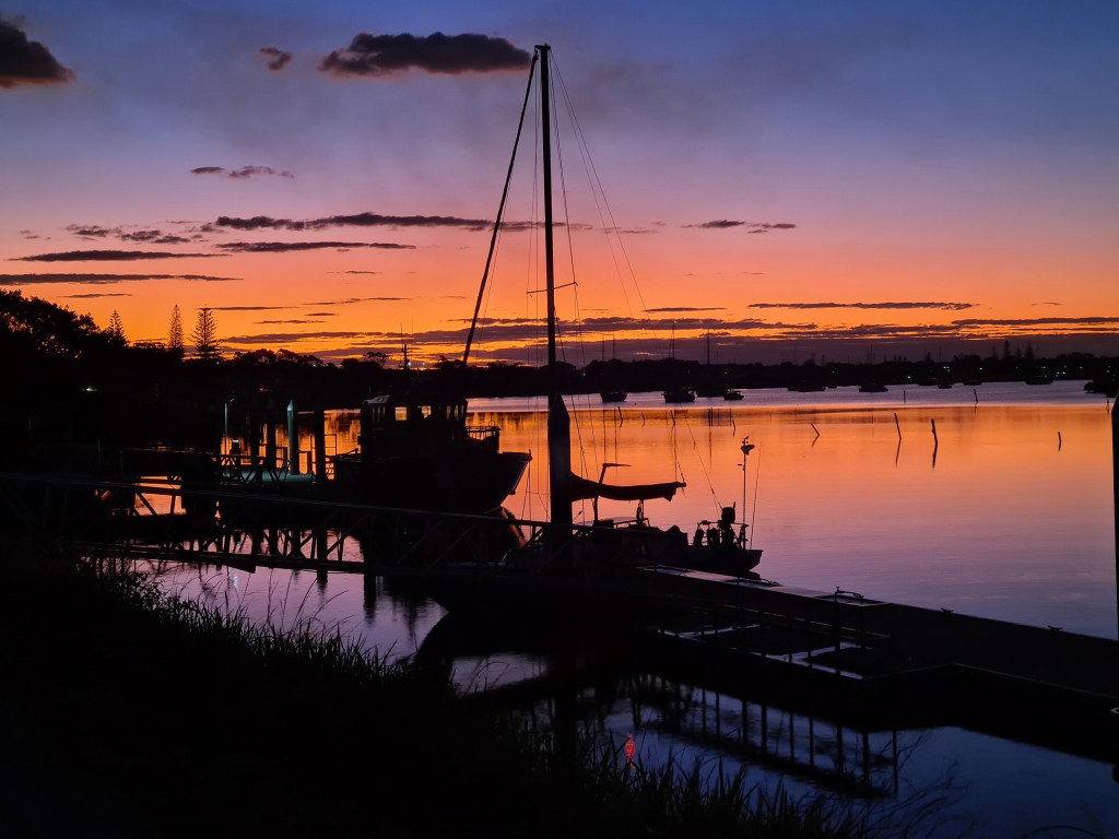 Back at the caravan park I caught the sun setting over the Clarence River. Blue enjoyed the scrap of Waygu beef burger Anita had saved for him.
