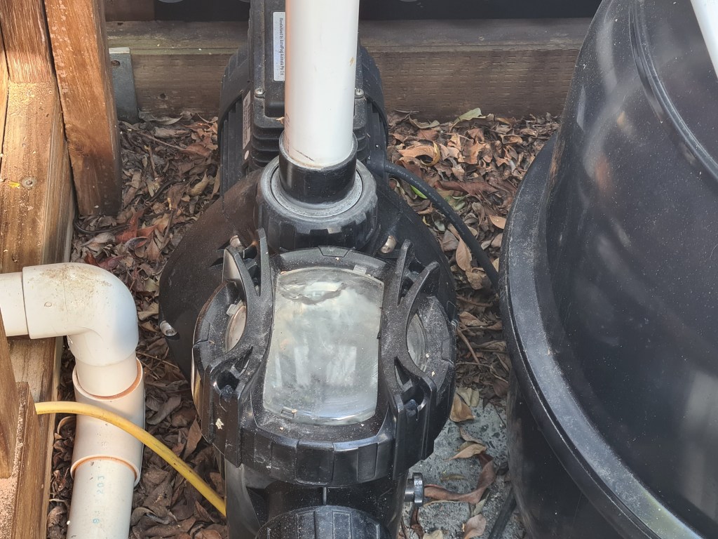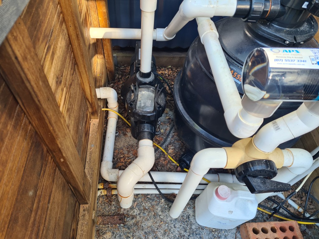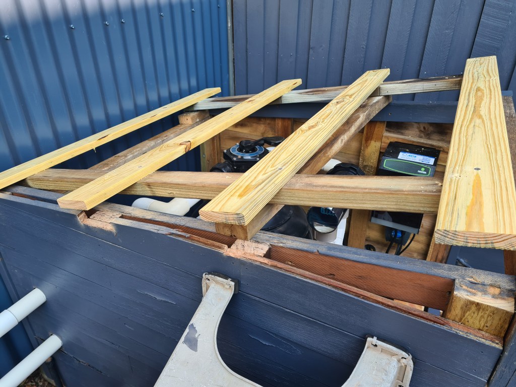 On Friday, I finished rebuilding a hinged roof for the pool shed. We need to be able to raise the roof to allow access to the sand filter controls and the other filter at the back of the shed.