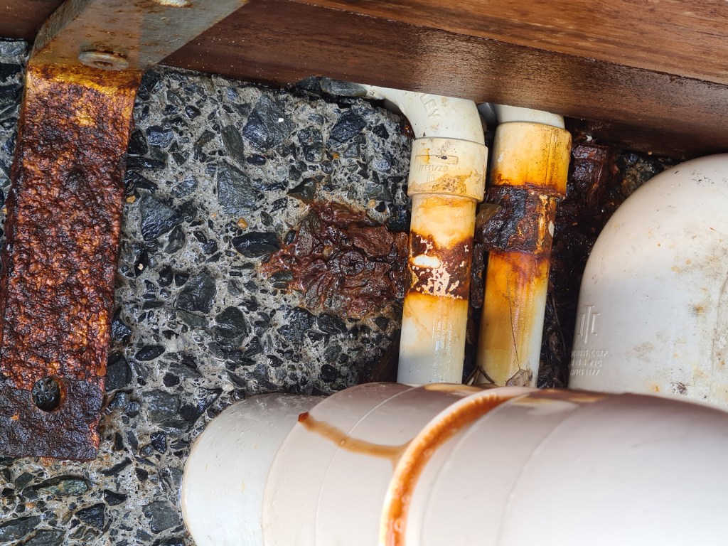 The pool service technicians have been sloppy with the pool acid, as metal brackets are badly corroded or have rusted away into the ether.