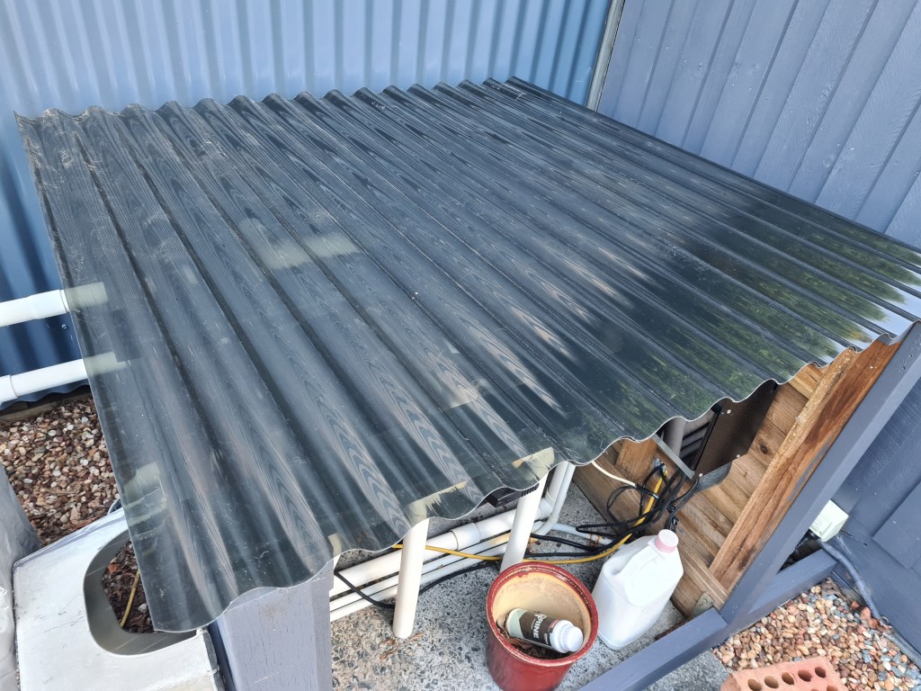 Today I cut the polycarbonate roofing to size and screwed down the top section. I didn’t manage to finish this as Bluey needed his social outing. He was really put out yesterday – Anita was away, and none of his friends showed up at the park. When I picked Anita up from the station this morning, he was very happy and excited. He also caught up with his friends this afternoon, and all is well in his world.