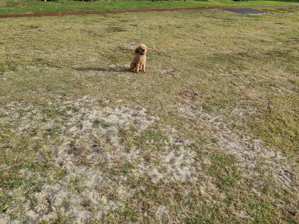 When I took Bluey for his morning walk at the park, he just sat there admiring the scenery. Tilly is exhausted after her efforts to chase that big dog out of her home and garden.