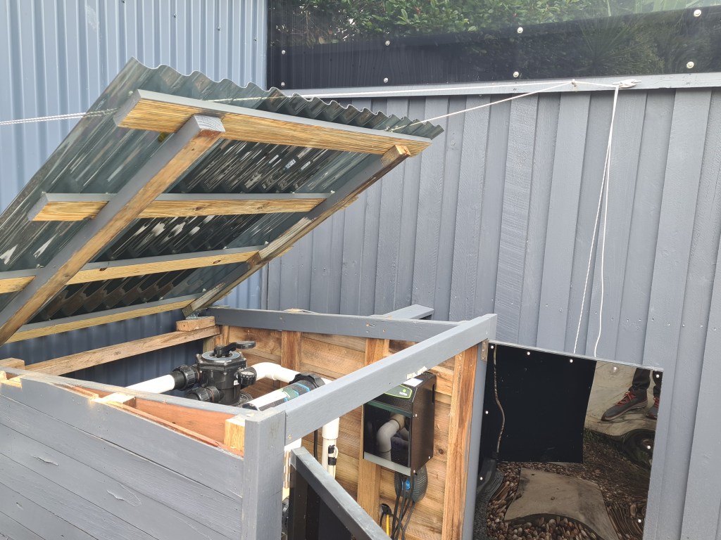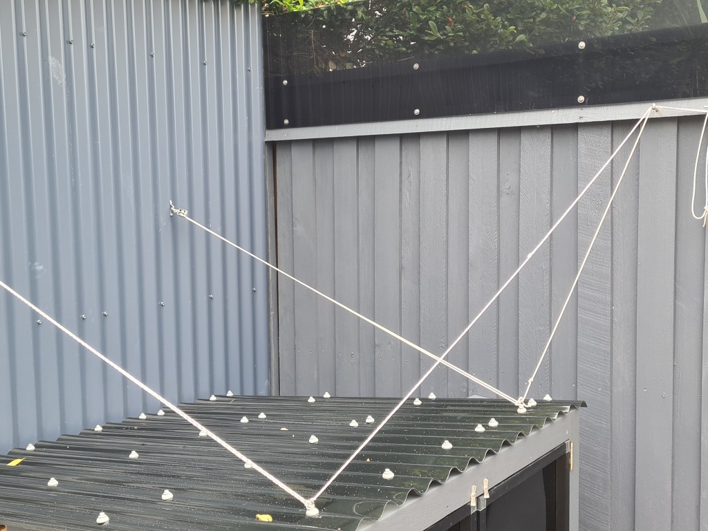 I also finished the roof lifting system for the pool shed. It needs to be raised by hand from the inside, but once raised, it can be held in position with the ropes. This is better than using timber props to hold up the roof.