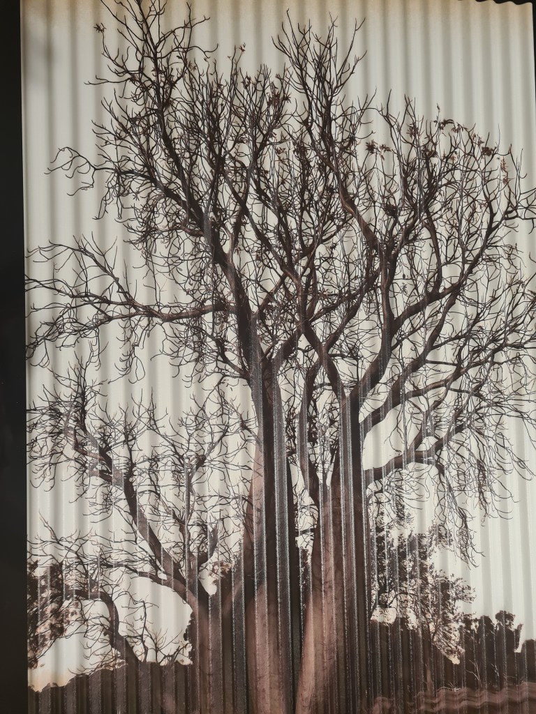 This morning, I drilled holes on the gatehouse wall, ready for mounting our Kununurra photo of a boab tree printed on galvanised mini orb. It was glued onto a black acrylic sheet and should be ready to handle tomorrow. We bought our smaller mini orb photo on our first trip to the northwest of WA. The photos are the same but our latest is larger. It will be seen by all visitors to our front garden.