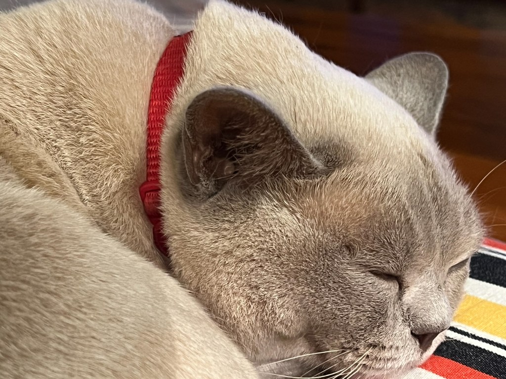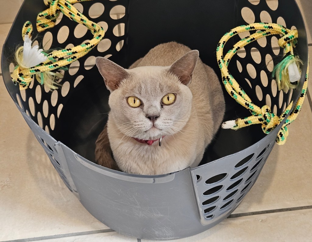Tilly loves this old laundry basket and patiently waits for one of us to carry her upstairs, where she eventually slept on a cushion.