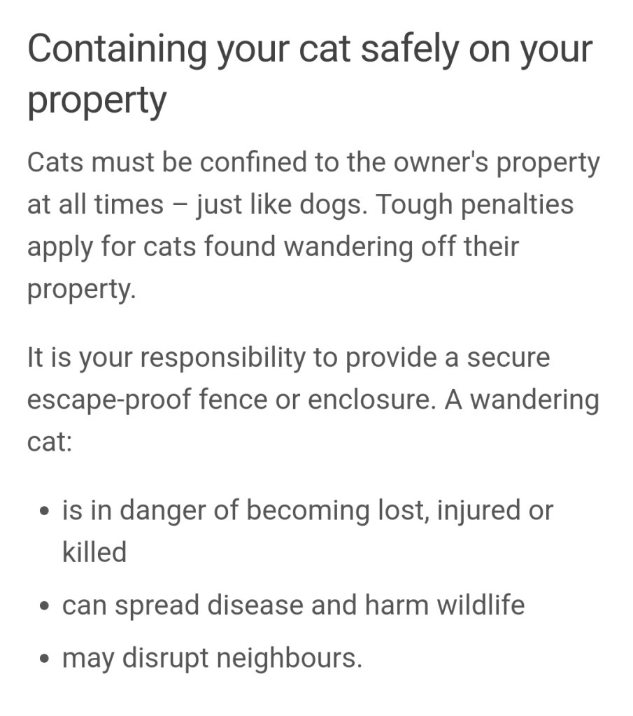 We have had more visits by wandering cats, usually early in the morning. Other neighbours are posting complaints about cats intruding on spaces occupied by their pets. I checked the Gold Coast Council website and found this very clear advice.
