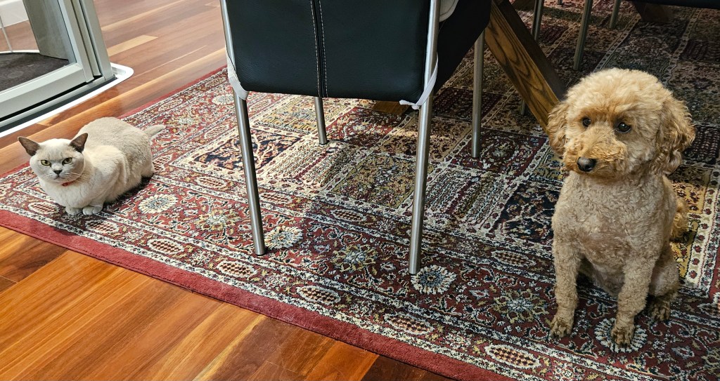 For dinner, Anita cooked us a marinated chicken from the Meat Hub. She put it on the rotisserie and it was delicious. Bluey and Tilly had already been fed, but they waited patiently for leftovers.