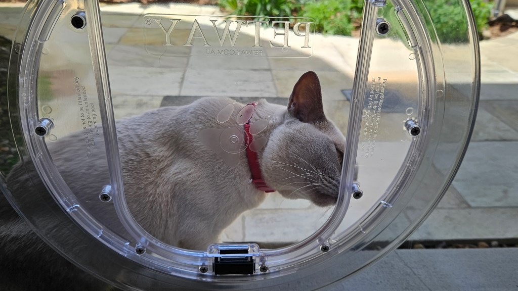 Our glazier installed the new piece of glass with a hole about 40 cms, ready to have the pet door installed. Tilly was quick to come into the house through the hole. She soon worked out how to come and go through the swinging door. I need to put a ramp outside before encouraging Bluey to use the pet door.