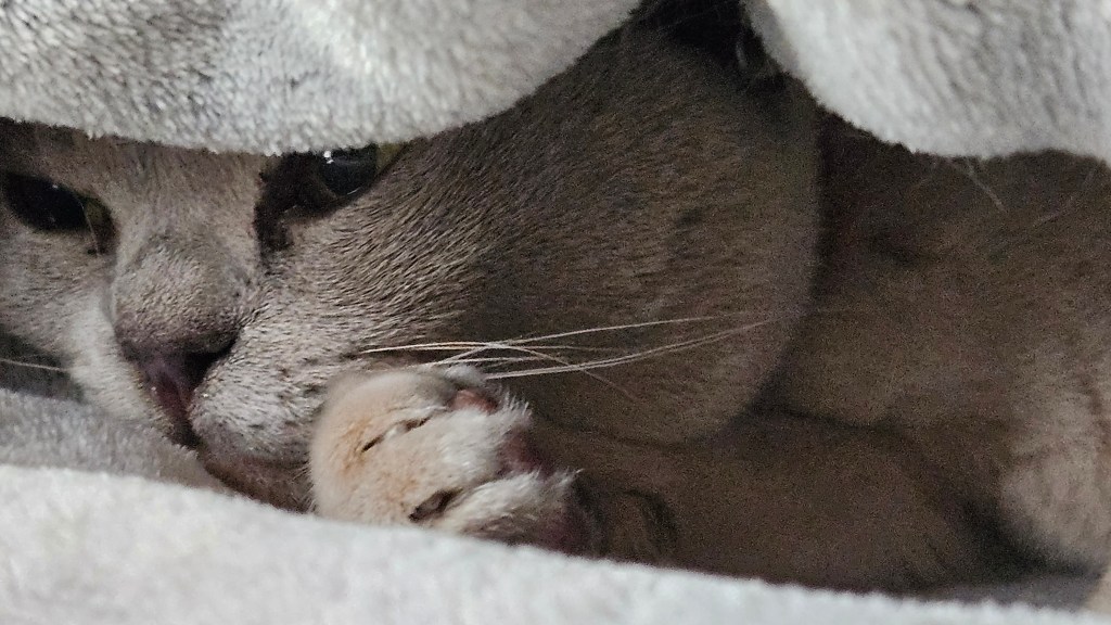 It wasn’t cold today, so I was surprised to see Tilly curled up in her pouch. Later I encouraged her to use the pet door by holding it ajar, but she came back in by herself. It will be much harder to get Bluey to let himself in and out the pet door.