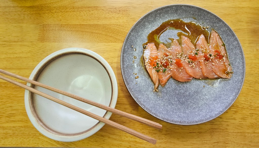 There is a new Japanese restaurant across the main road, so we tried it this afternoon. We sat outside under cover with a well-behaved Bluey thinking he was guarding the entrance. We sampled the menu and enjoyed every dish. I started with this delicious salmon dish, but the bao, gyoza, fried rice, and karate chicken were all lovely. The rain started just as we reached home.