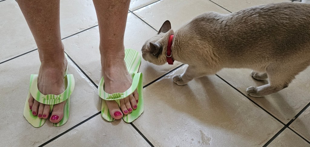 Anita had her nails done, but didn’t wear appropriate shoes. The nail technician sent her home wearing these disposable thongs, which she wore shopping at Woollies. Tilly was perplexed.