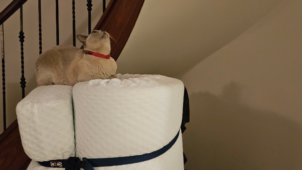 This evening Tilly found her way to the top of the rolled up caravan mattress. I don’t know how she got there without knocking it over.
