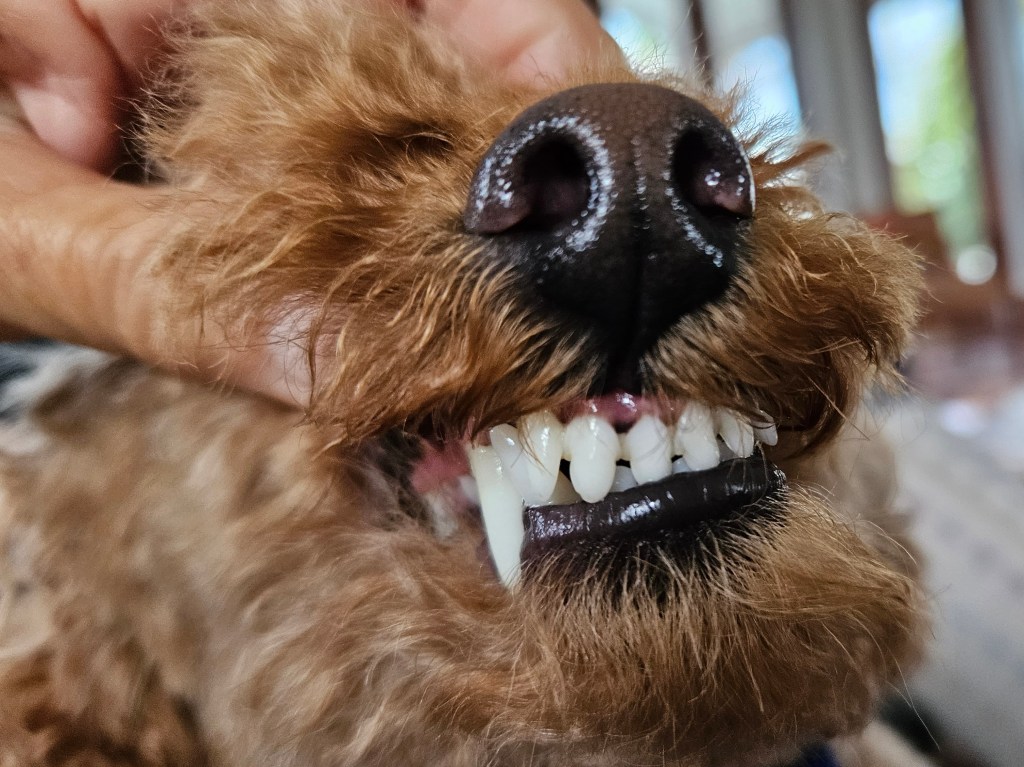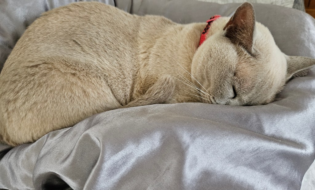 Tilly thinks my satin pillowcase is hers. I will buy one for each of the critters – red for Tilly and blue for our boy who showed off his clean teeth.
