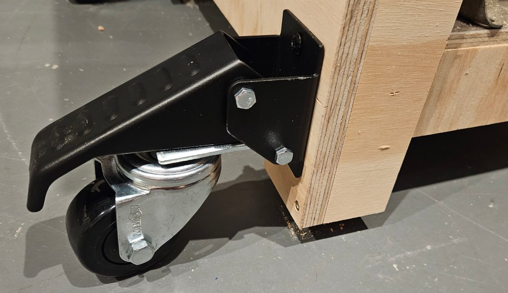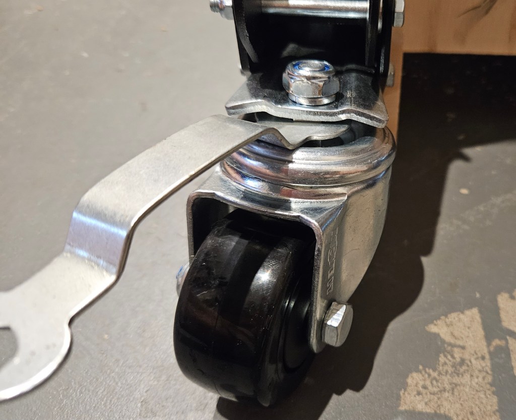 A cancelled appointment left us having breakfast at the Salt Cafe with Bluey. Back at home I fitted the wheels to my planer table. This is a fairly simple job, except for working on the concrete floor. I measured the location where two holes had to be drilled, then screwed on the lifting mechanism. The wheels are bolted on last. The table lifts when the levers are pressed down and it can be wheeled.