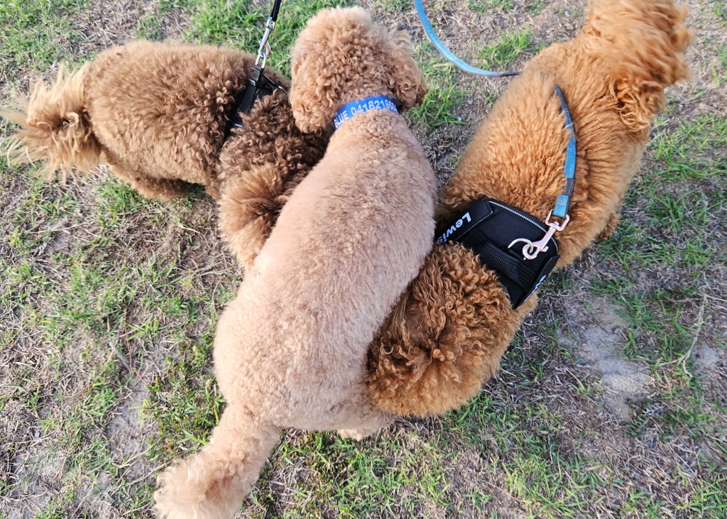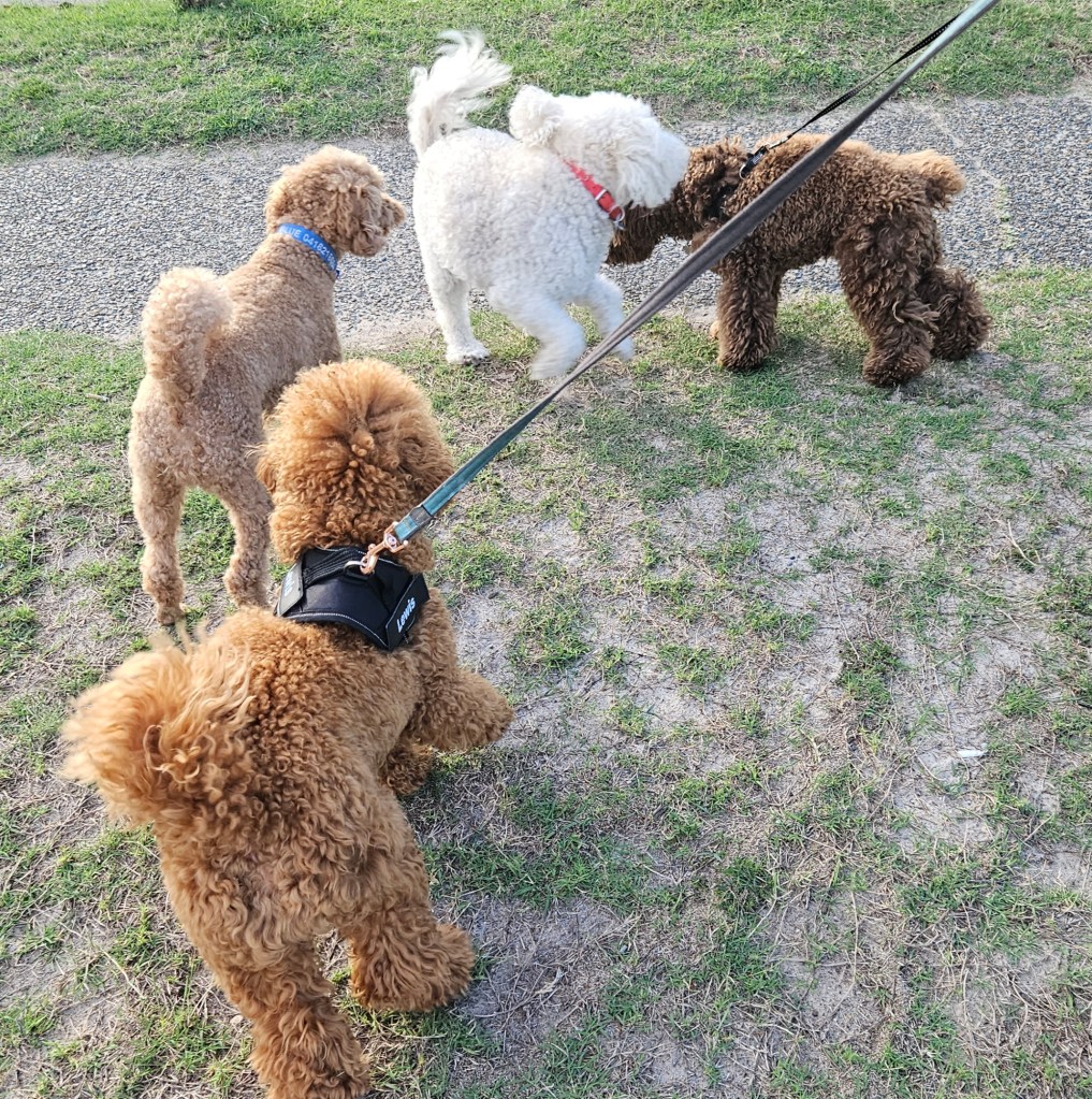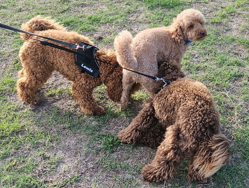 At the park, Bluey was the centre of attention from two other toy poodles. Lewis, the reddish one lives in our street, and Rocky, the brownish one, is his brother and a regular visitor. Bluey wasn’t on a lead, so could have walked away. When Lewis started humping Bluey’s head, he was told off. Bluey’s friend Odin the white Bishon joined the party.
