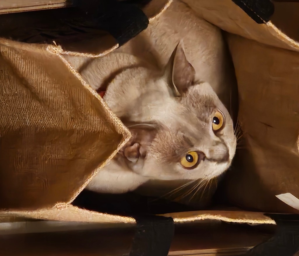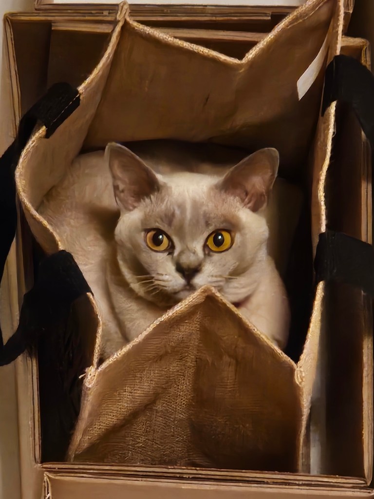 I opened the empty pool cleaner box, and Tilly showed off from inside a shopping bag.