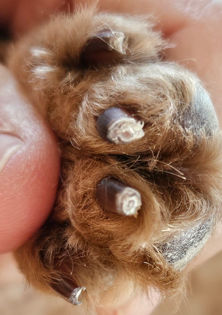 Bluey is having trouble climbing our staircase. He loses his rhythm three quarters of the way up, partly due to fear of Tilly attacking him, but also because his claws are so long. I trimmed them, but his two middle claws on both front paws are unusually long. I cut these claws as close to the quick as possible.