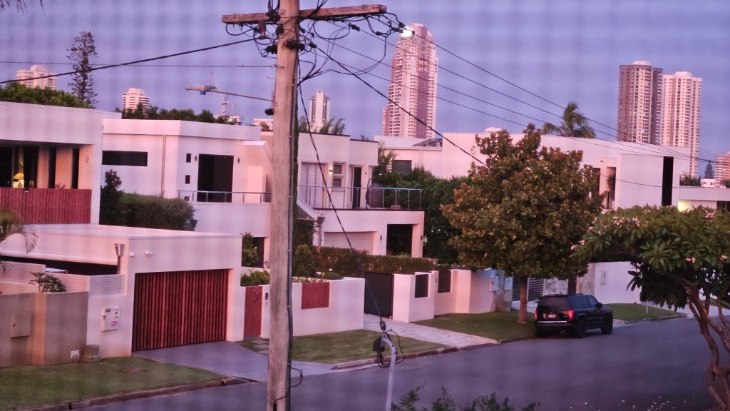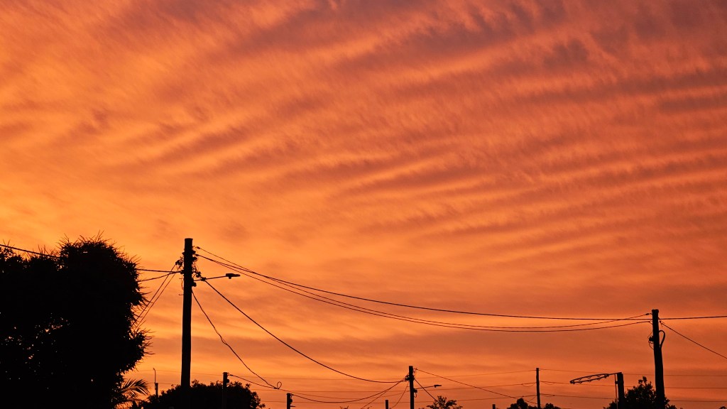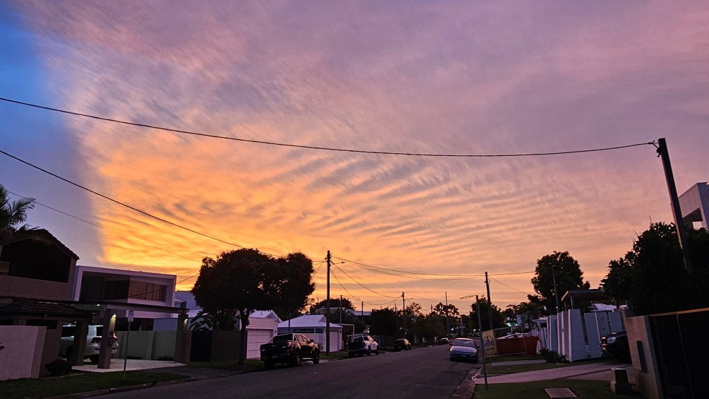 When I walked Bluey this afternoon, there was a cool breeze. At sunset the sky was very unusual, with the cloud formation having a distinct edge. Houses in our street reflected the strange light.