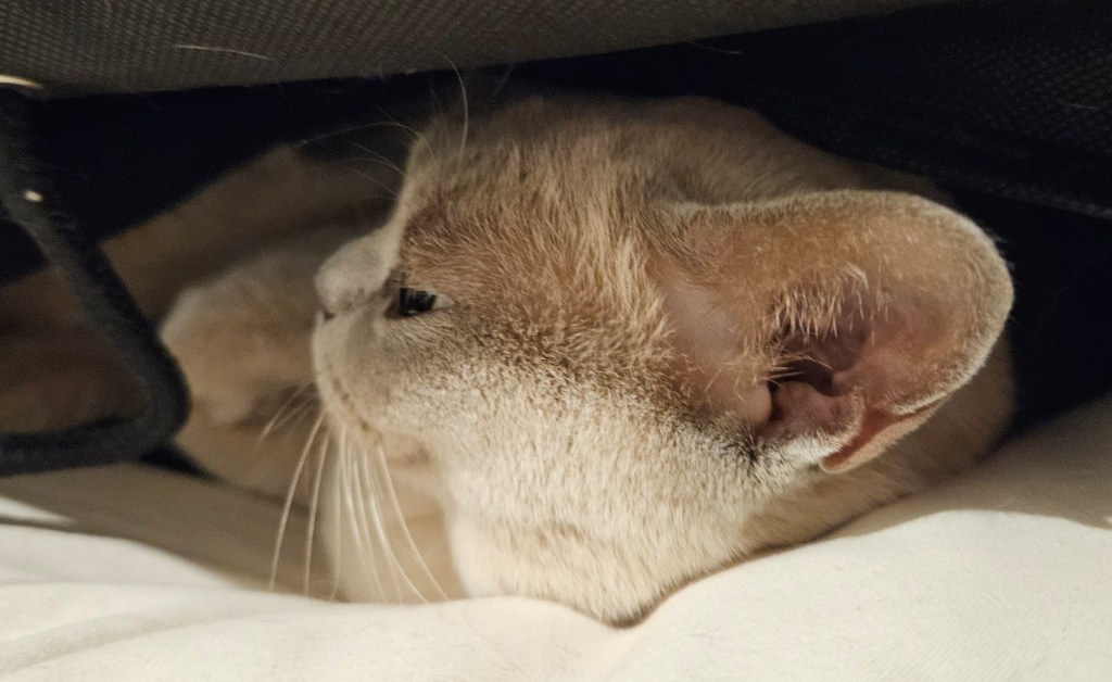 Bluey chased a golden retriever along the beach, but he never follows her into the water. The river is brown with dirty runoff so is probably not very healthy. At home I found Tilly comfortable in the pillow bag.