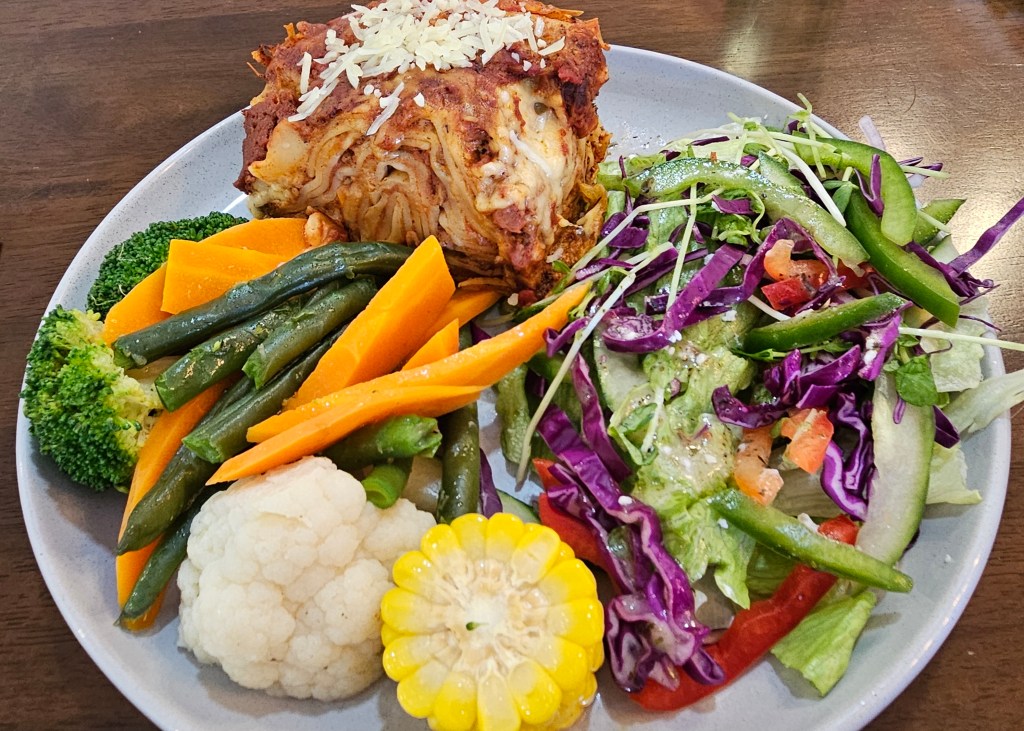 We had an early meal at the Services Club. It was still warm when we walked the 800 m downhill. Our meals were very good and cheap. I had the lasagne special with salad and vegetables. Anita had to pause a couple of times walking back up the hill!