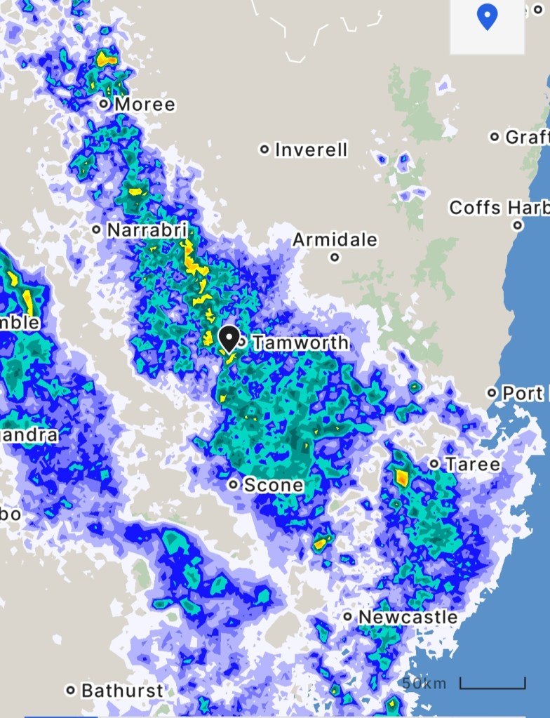 Our friends didn’t arrive until after 7 pm, having back tracked to a tyre shop when a rear tyre on the motorhome had low pressure. It was raining when they arrived and the rain continued. Tamworth has not had the rain that much of the country has received, so tonight’s soaking will generally be welcome, but not by any campers who have arrived early for the Tamworth Country Music Festival!
