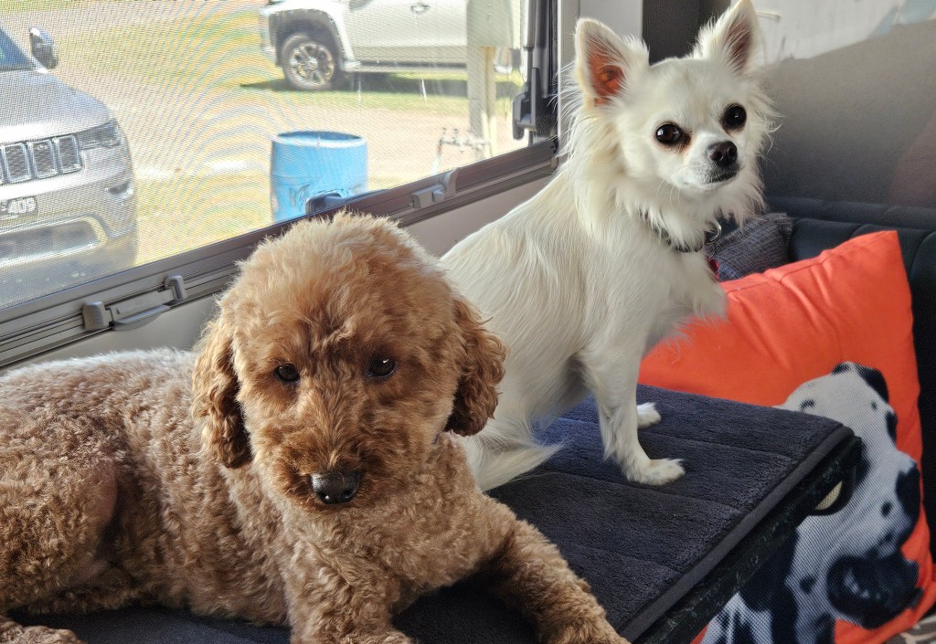 Bluey and Leo have spent time together in the motorhome, but always with one or more humans. Tonight, we left them alone for more than three hours, and they seem to have been well-behaved. They were both crazy with excitement when we got back from seeing Amber Joy Poulton’s show.