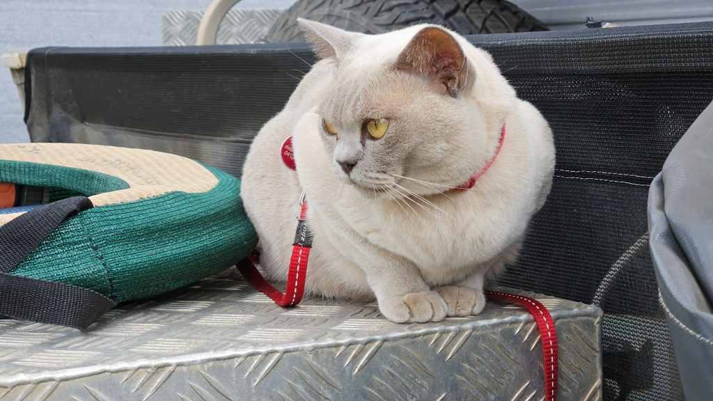 While it was cool this morning, the Adventurous Tilly emerged, climbing onto the van and into the cargo bay, and running off the minute her lead was untied.