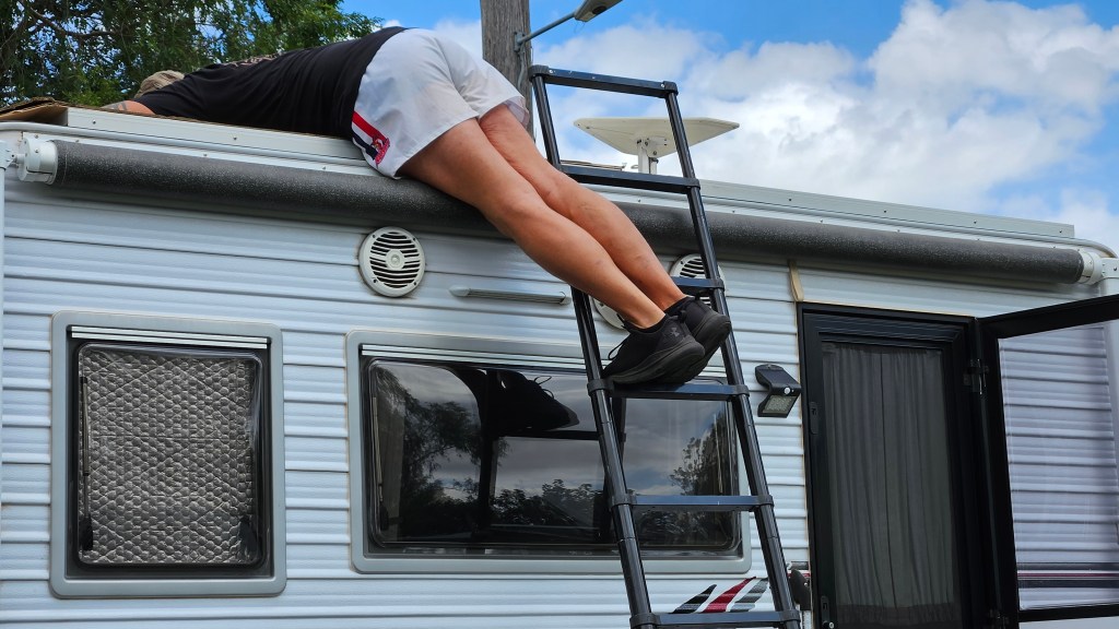 Safety wasn’t a consideration! After watching this ladder move precariously, I asked if he would like me to tie it to the van, but he said it was OK. If it was to fall to the right, there would have been nothing on the roof for him to grab and hold securely, as I had taken down my BOGOUT rope ladder.