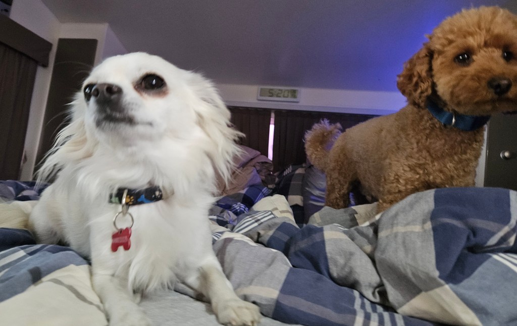 While we were out, I monitored Bluey on our WiFi camera. He moves around a lot, constantly checking the window. Tilly sleeps at the door, where it will be a little warmer than the rest of the van, which we keep cool with the AC. This evening, he fell asleep on my shoulder, which was not very comfortable for me.