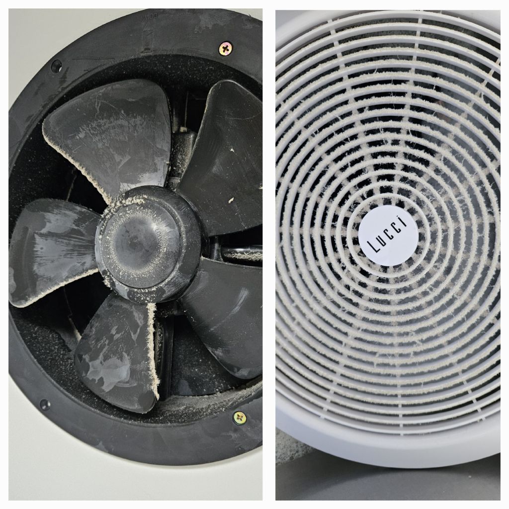 While I had the ladder upstairs, I cleaned the bathroom extractor fan. I removed the outer grill, then took the fan out because it was covered with blown-in ceiling insulation.