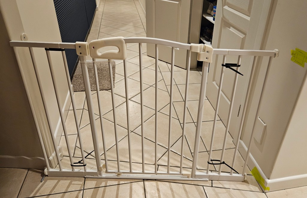 I have trained him to go out the doggy door, but he prefers us to open the front door for him. He doesn’t willingly go down the stairs if I have told him to use the doggy door. I doubt he has ever taken himself outside when we were not home. The gate will remove any risk of Bluey hurting himself on the stairs when we are not home.
