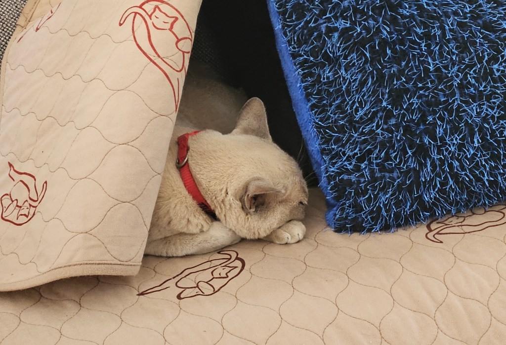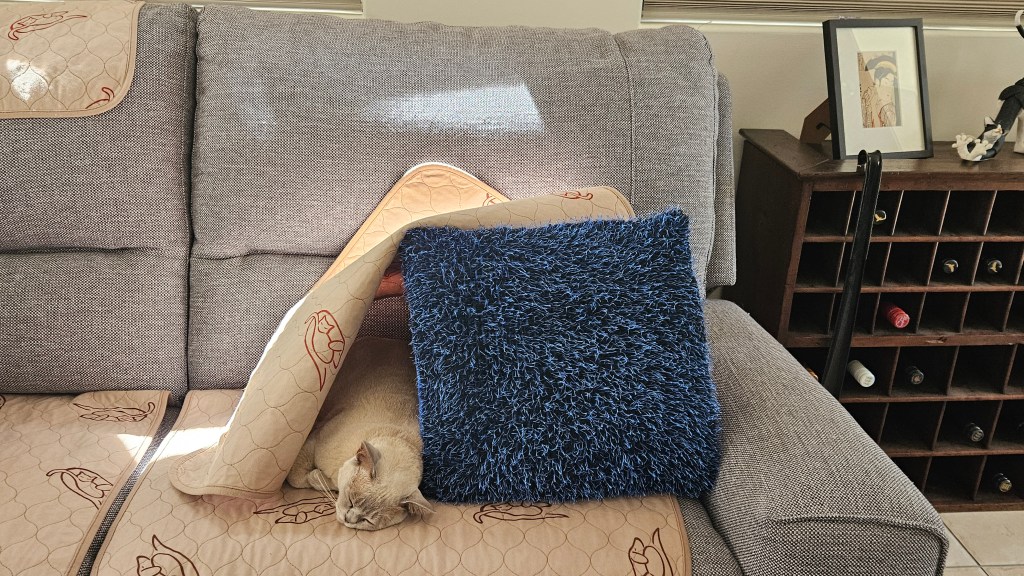 The temperature has been back up to 30° so I forced myself to tidy and organise papers and files in my office – tedious but necessary. Bluey kept me company, but Tilly spent a long time sleeping under the shelter she had made for herself by pulling down the pet cover.