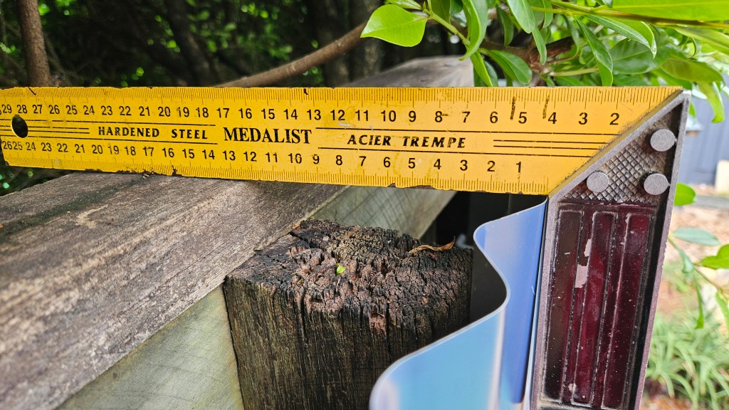Our rear neighbours were out, so I put a ladder against the fence to measure the distance from the boundary fence to our corrugated iron fence. This may become relevant if our neighbour refuses to cut his hedge.