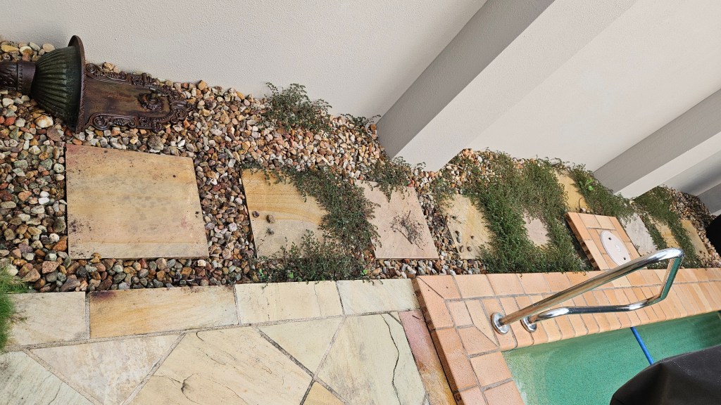 It was cooler on Sunday morning after overnight rain, so we made a start on the weeds in the pool area. After an hour, Anita had weeded several garden beds while I had only managed to clear the weeds around one of the pavers. To get to the base of each weed I had to move pebbles, before pulling out each weed with my fingertips.