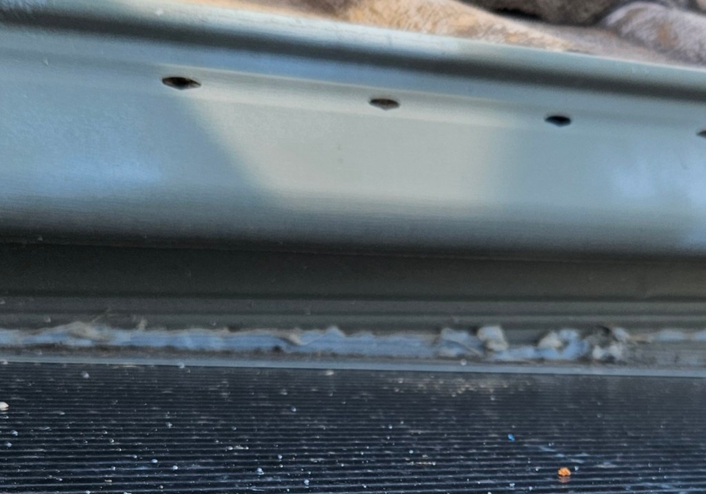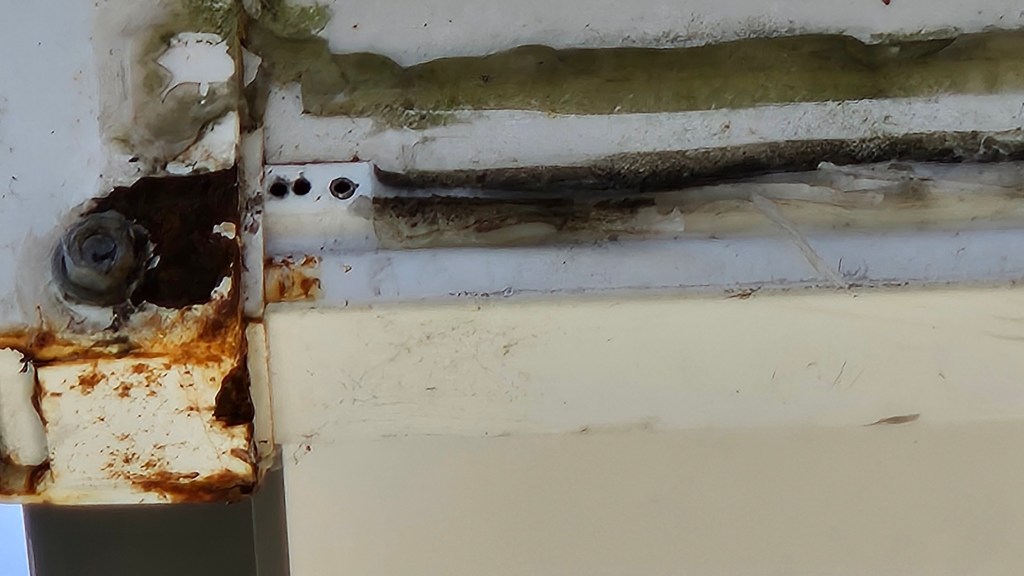 The damage caused by this structure is significant, with rust, holes, and silicone to be removed, before we can repaint.