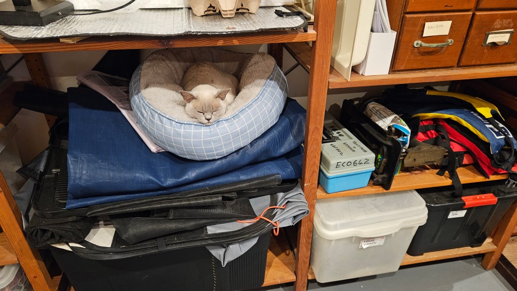 Today the rain stopped further work on the patios, so I worked on various projects in the garage. My apprentice enjoyed a rest watching me work, then fell asleep.
