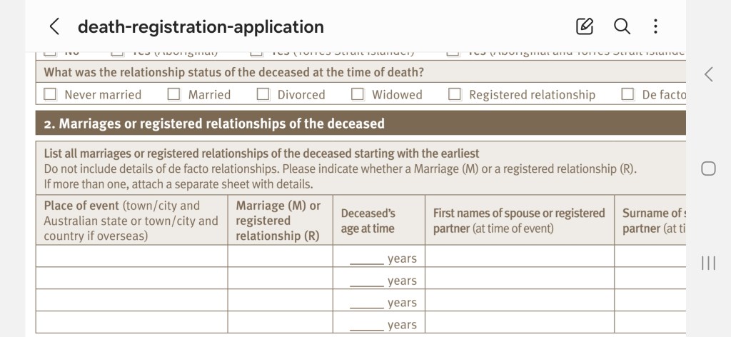 Two of our elderly male neighbours died last week, including my friend’s defacto partner of 28 years. She was upset at not being mentioned at all on his death certificate. One of his children is the executor of the will, so he was named as the person reporting the death. The Death Registration Form allows describing the deceased’s relationship at the time of death as “death facto” but specifically states only marriages and registered relationships are to be listed. I immediately sent a complaint to the Justice department, which manages the register of births, deaths and marriages.