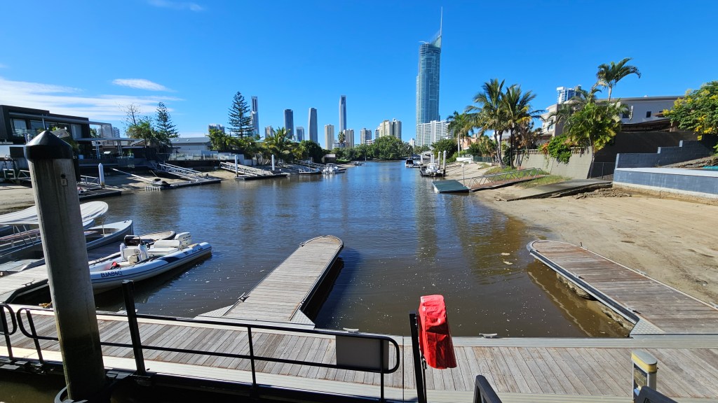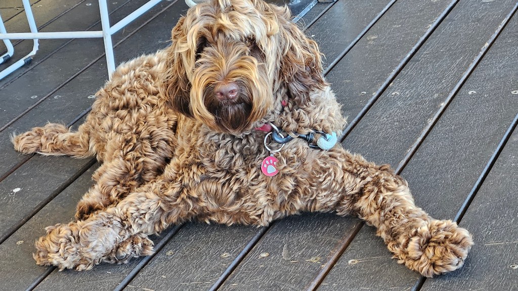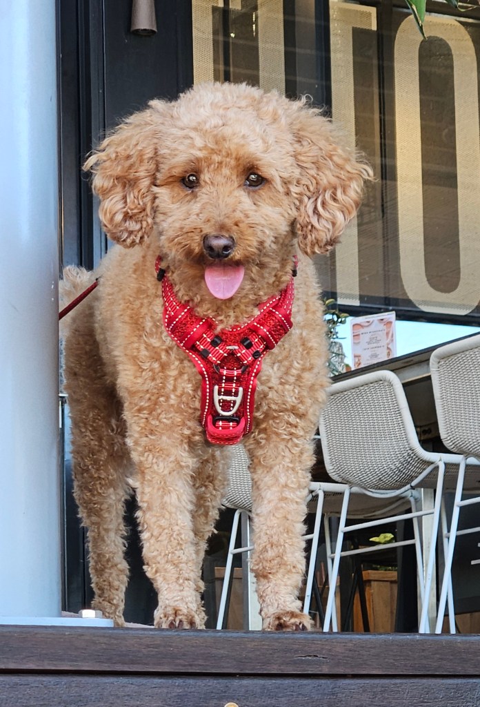 We treated ourselves to lunch at Edgewater on the Isle of Capri, sitting overlooking the canal and small battery-powered boats. Bluey enjoyed his outing but didn’t want to interact with the groodle.