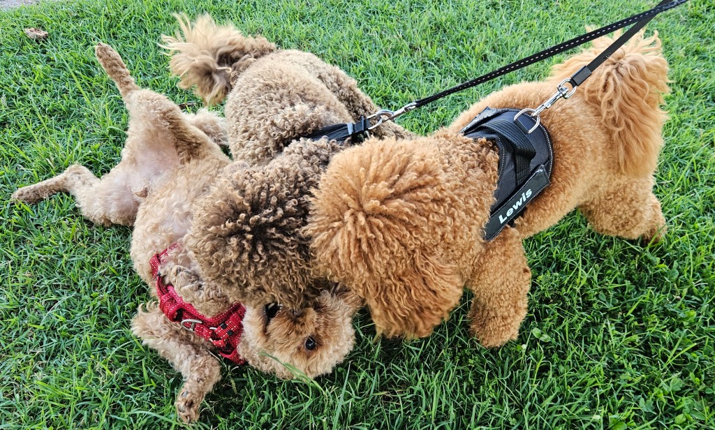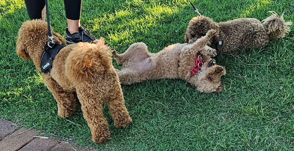 These toy poodle brothers on their leads would not leave Bluey alone, and he loved the attention!