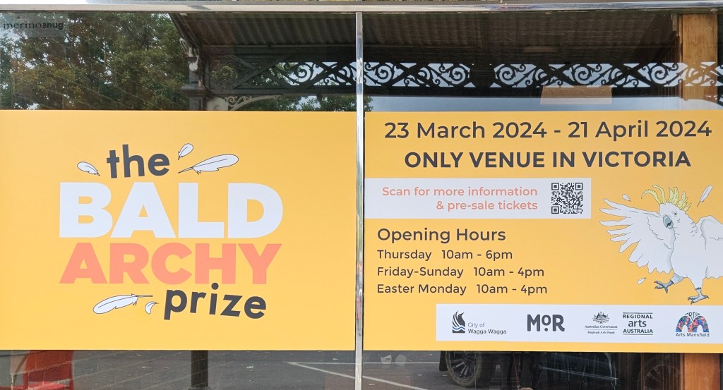 We just missed out seeing the Bald Archy exhibition in Mansfield. The Shire Council advertising failed to name the winning artist – Judy Nadin – or name Sam Kerr as the subject of the caricature titled Flippin’ Kerfection depicting Sam’s celebratory backflip. The exhibition was in a lovely building with amazing stained glass.