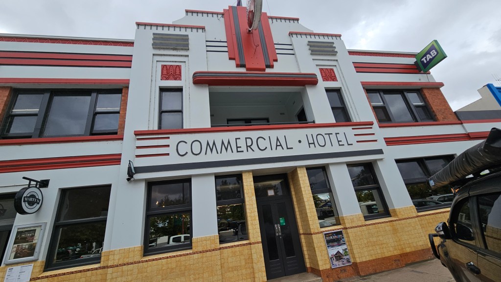 The Commercial Hotel is striking, while the sombre building housing the RB Sellars clothing store was once a branch of the Bank of NSW.