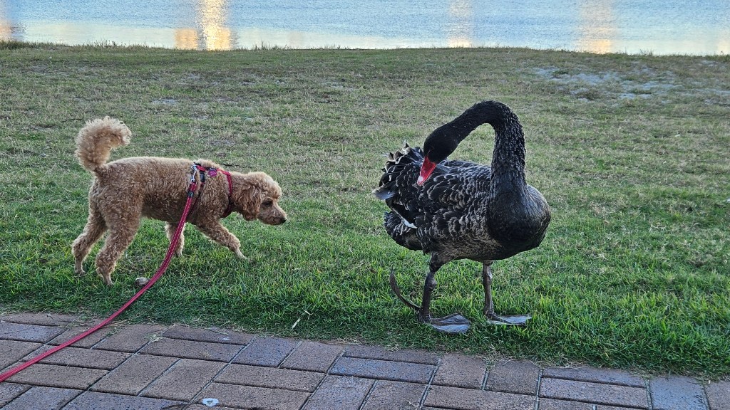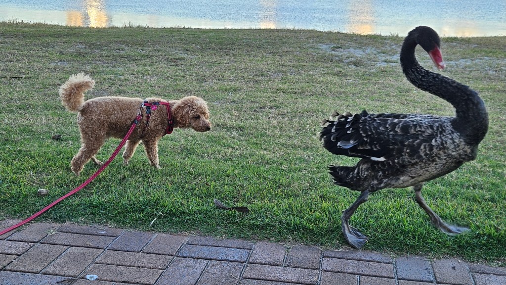 Bluey and Tilly have chased each other and played every day. He has caught up with his friends. Yesterday this swan chased a dog that got too close, but when Bluey approached slowly from behind, the swan took off.