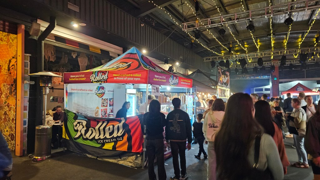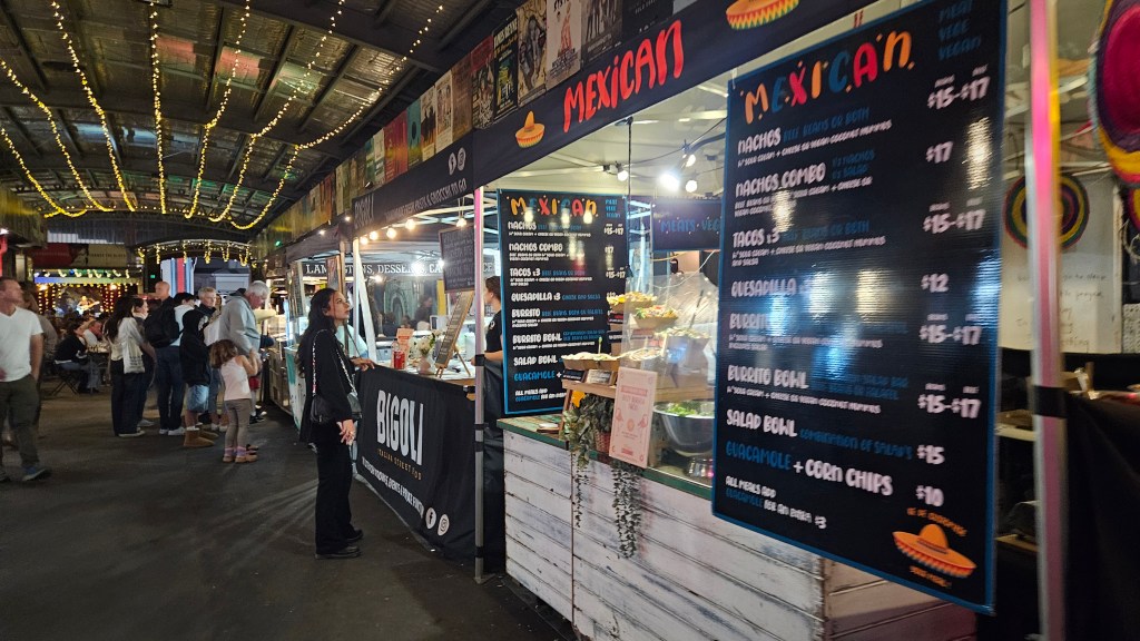 On Saturday night I went to Miami Marketta with a friend to see the Felicity Urquart and Josh Cunningham show. Neither of us had been there before and were amazed by the large crowd choosing their meals from the many food trucks that were all under cover. The walls are covered by artwork, including the Bathrooms.