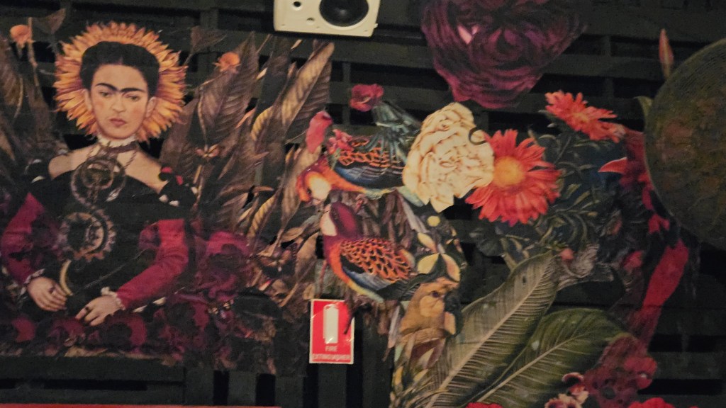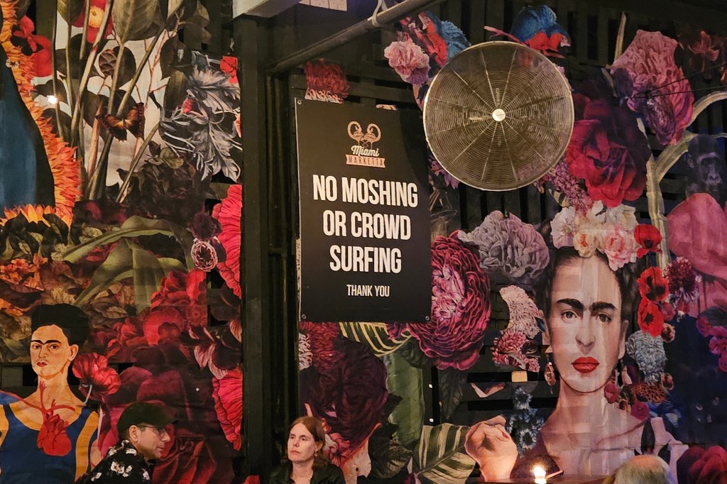 The ticketed event was in Studio 56, but when the volume was low during our show, we could hear other music from nearby. The walls of Studio 56 are adorned with multiple pictures of Frida Kahlo. I had to laugh at the sign prohibiting moshing and crowd surfing. There were only about 100 people at our show, sitting at well spaced cabaret style tables, but recently 600 crowded in to Studio 56 to see a band I have never heard of, when the sign might have been relevant!