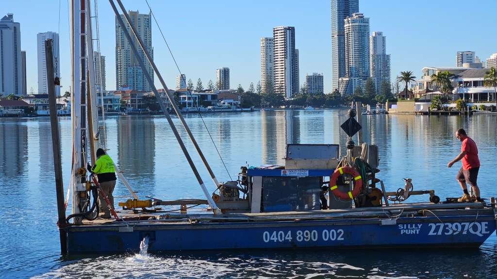 Yesterday morning this work boat installed two pylons near the jetty in front of 1 Yacht St. This is the house where a fence on the jetty has a locked gate that prevents non residents from walking on a public beach. The pylons appear to have been placed in front of parkland, not in front of the house.