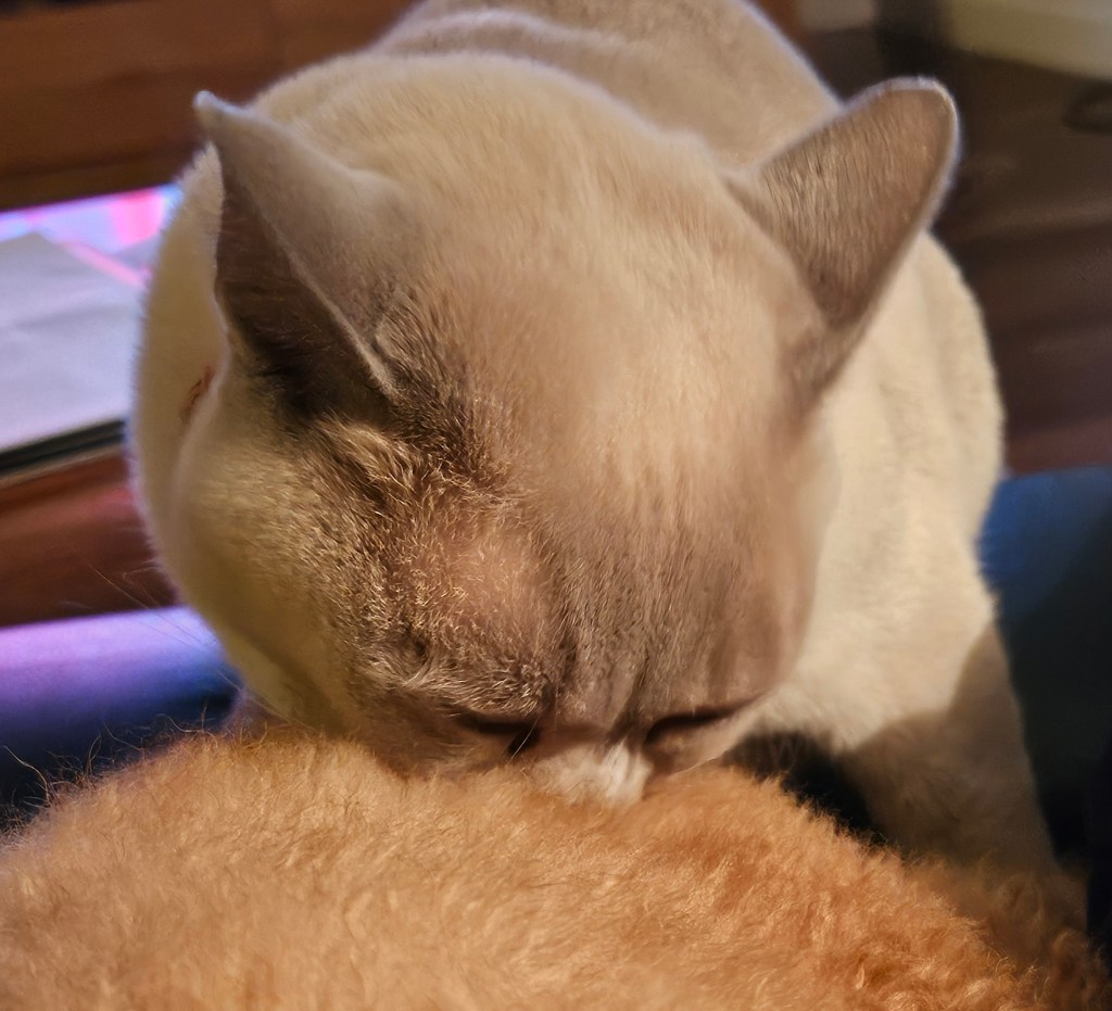 As well as playing together a lot since we have been home, the critters have been keeping each other company. After I brushed Bluey and removed dozens of seeds from his fur, Tilly decided to give him the finishing touches.