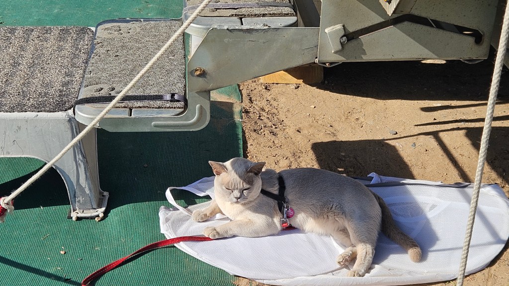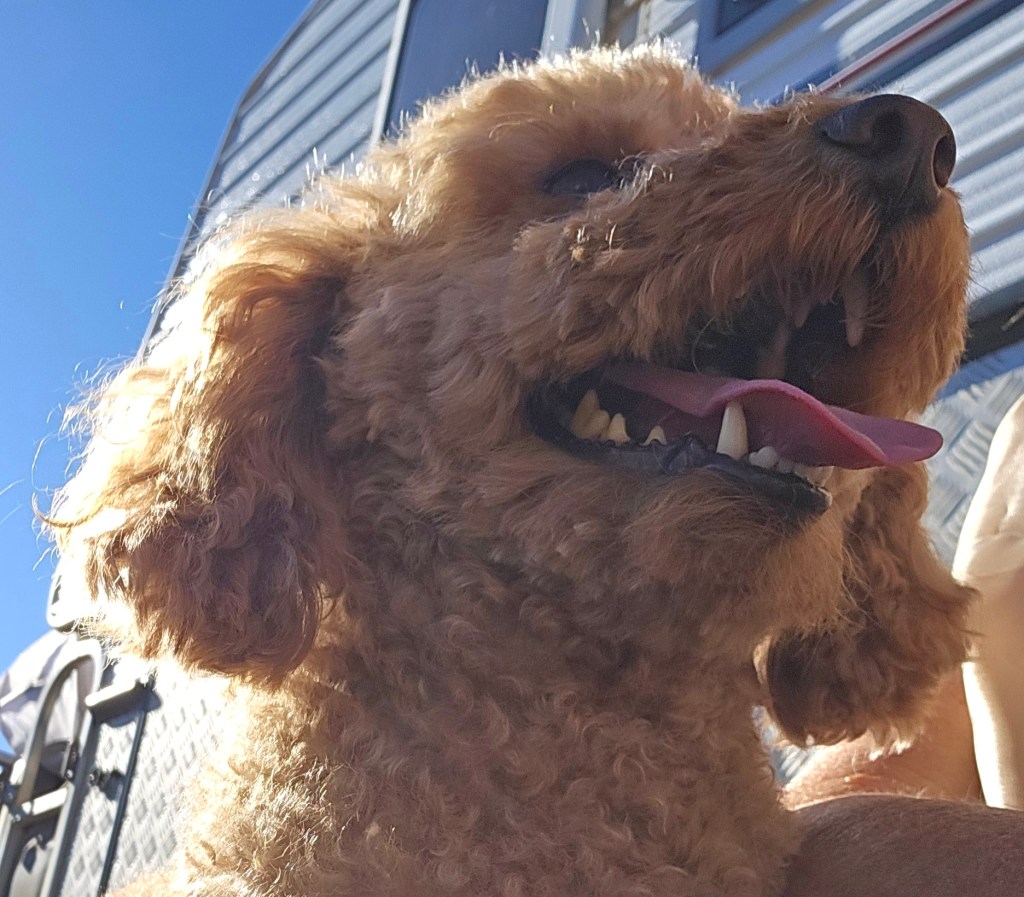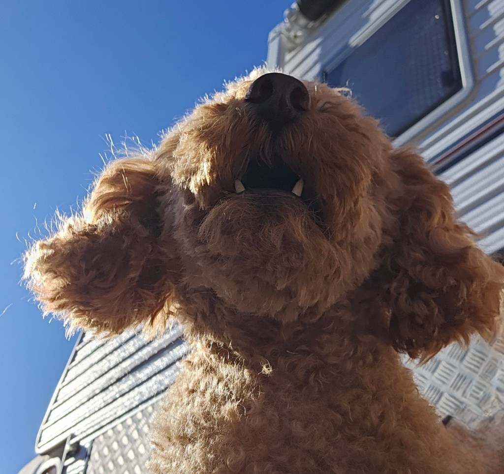 Our friends are parked next to us and by late afternoon, Bluey was chomping at the bit wanting to visit them. It was a short visit as he kept patting me, which I realised meant he was hungry. Both critters are eating more in the cooler weather.