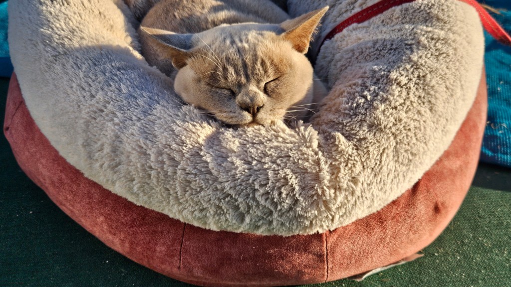 By late afternoon she was snoozing in her doughnut, keeping out of the cold wind.